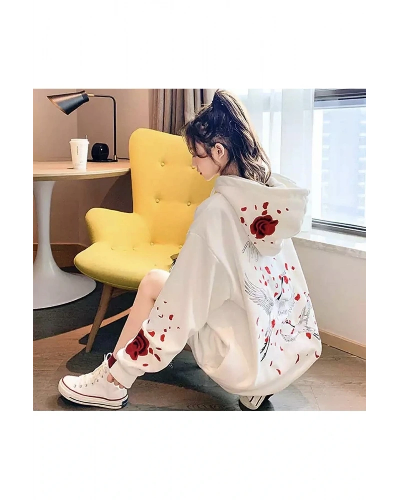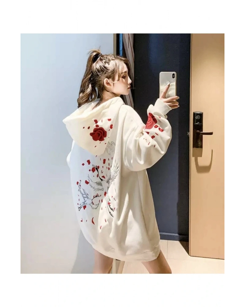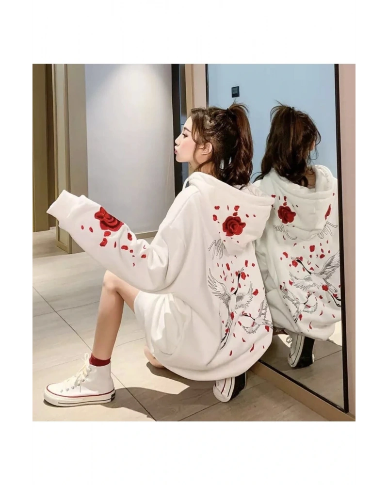Büyük Beden Kapüşonlu Farmuarlı Japon Red Rose Baskılı Oversize Kadın Ceket-sweatsh Beyaz
