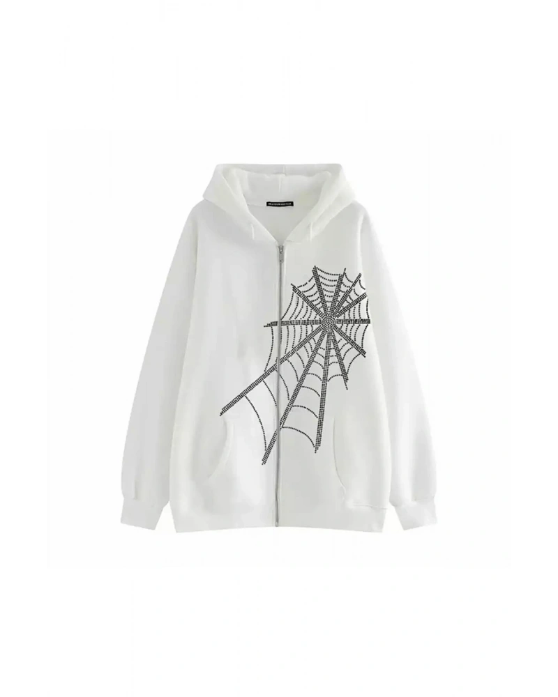 Büyük Beden Kapüşonlu Farmuarlı Silver Örümcek Ağı Baskılı Oversize Kadın Ceket Swe Beyaz