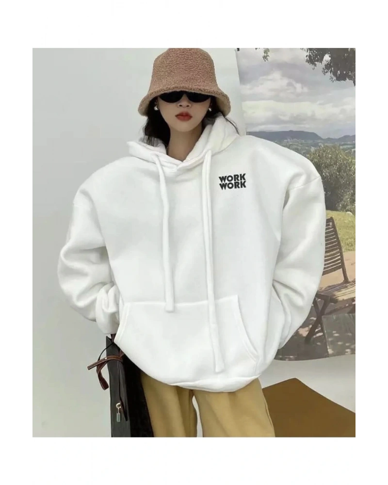 Büyük Beden Kapüşonlu Work Work Baskılı Tam Kışlık Geniş Oversize Kadın Sweatshırt Beyaz