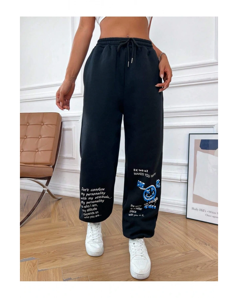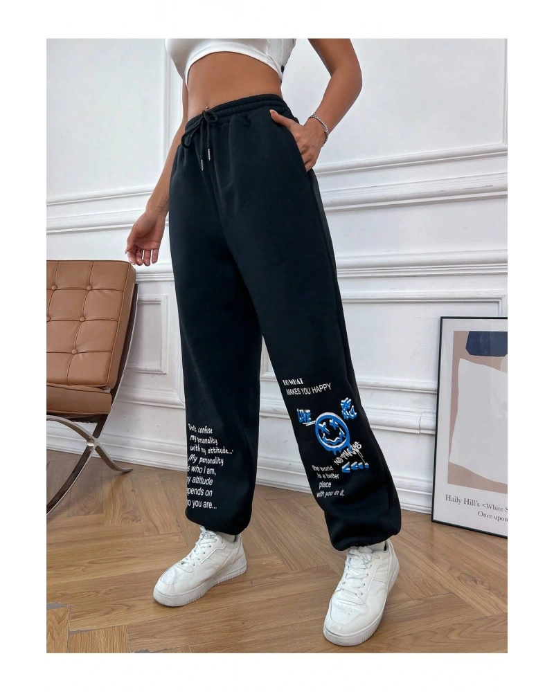 Cartoon Face & Slogan Graphic Drawstring Waist Eşofman Altı