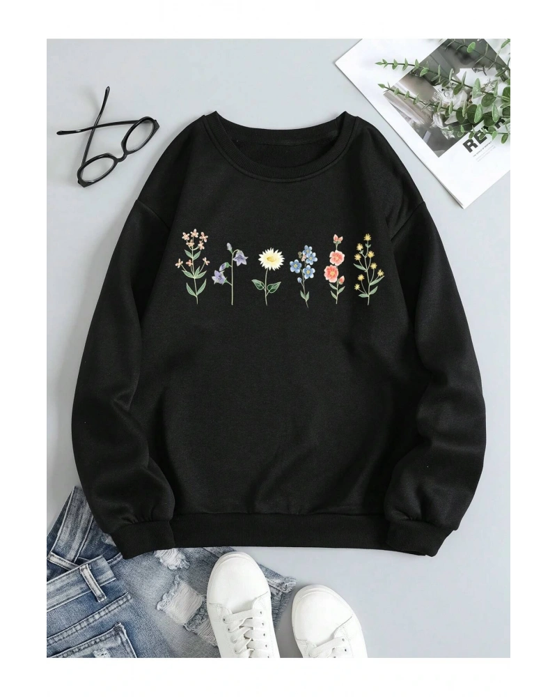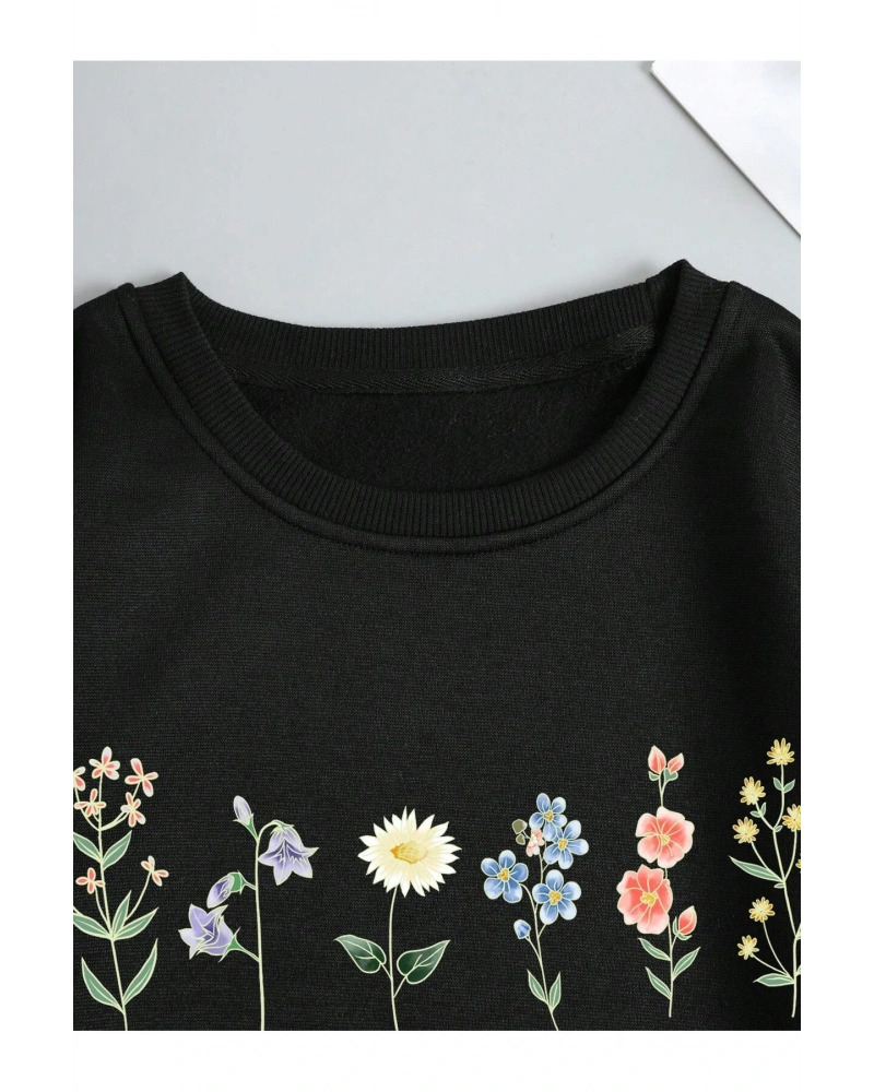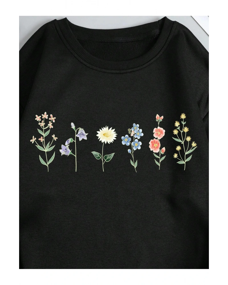 Çiçek Desenli Termal Astarlı Sweat Siyah