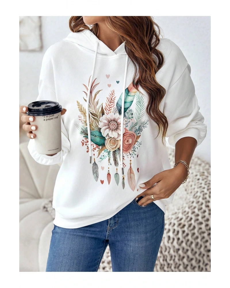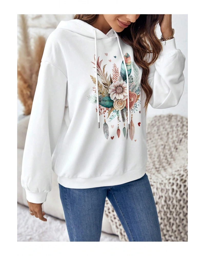 Coke serisi Floral & Feather Print Drop Shoulder Drawstring Hoodie