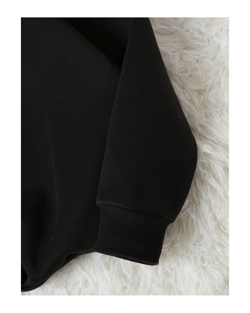 Siyah Yakasız Tüy Baskılı Unisex Sweatshirt