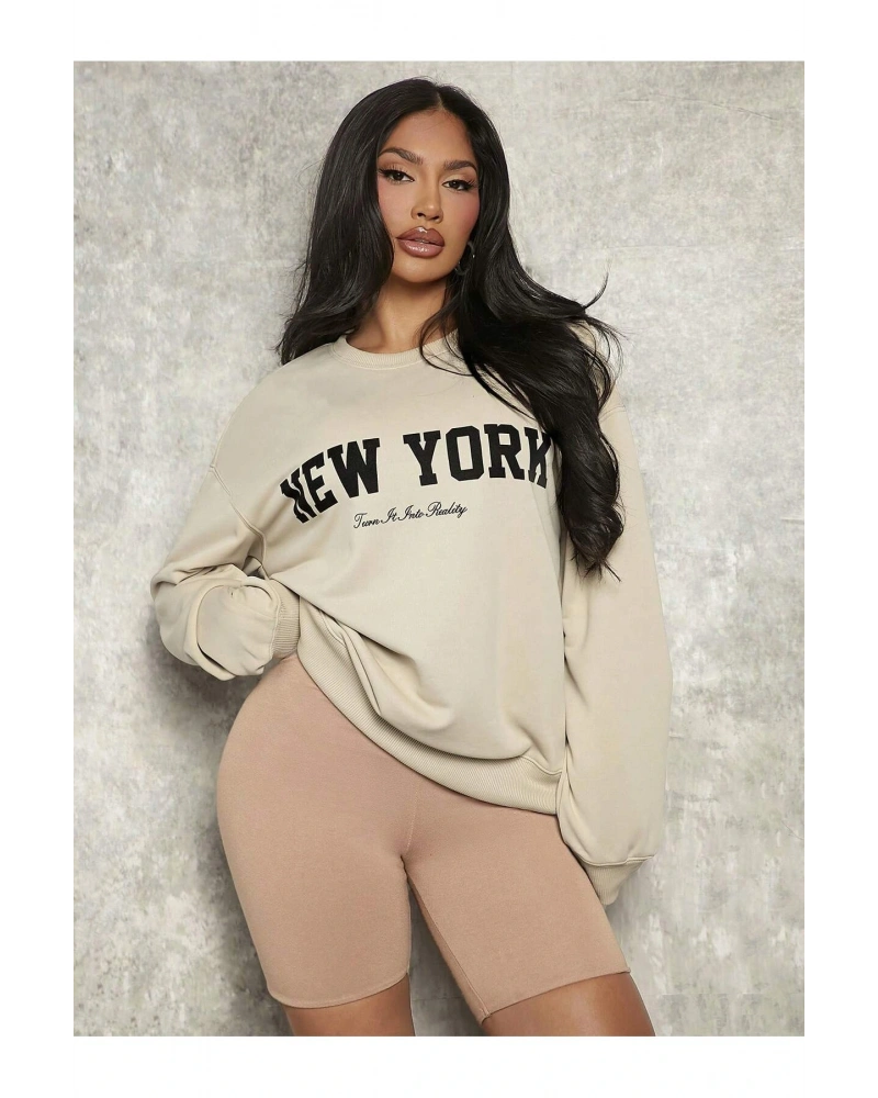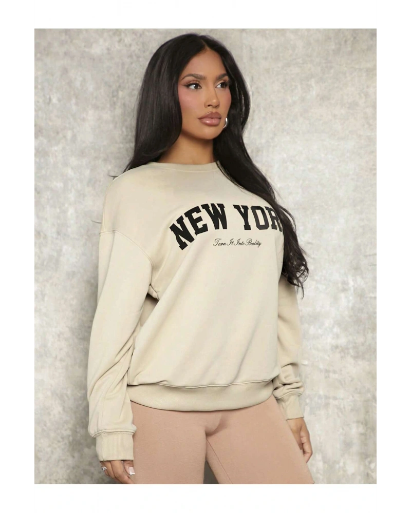 Sloganlı ve Yıldız Desenli Düşük Omuzlu Oversize Sweat Bej