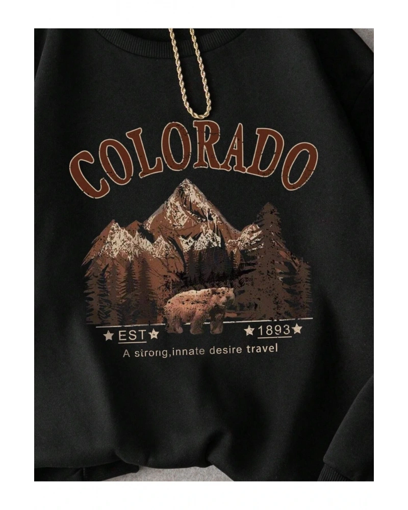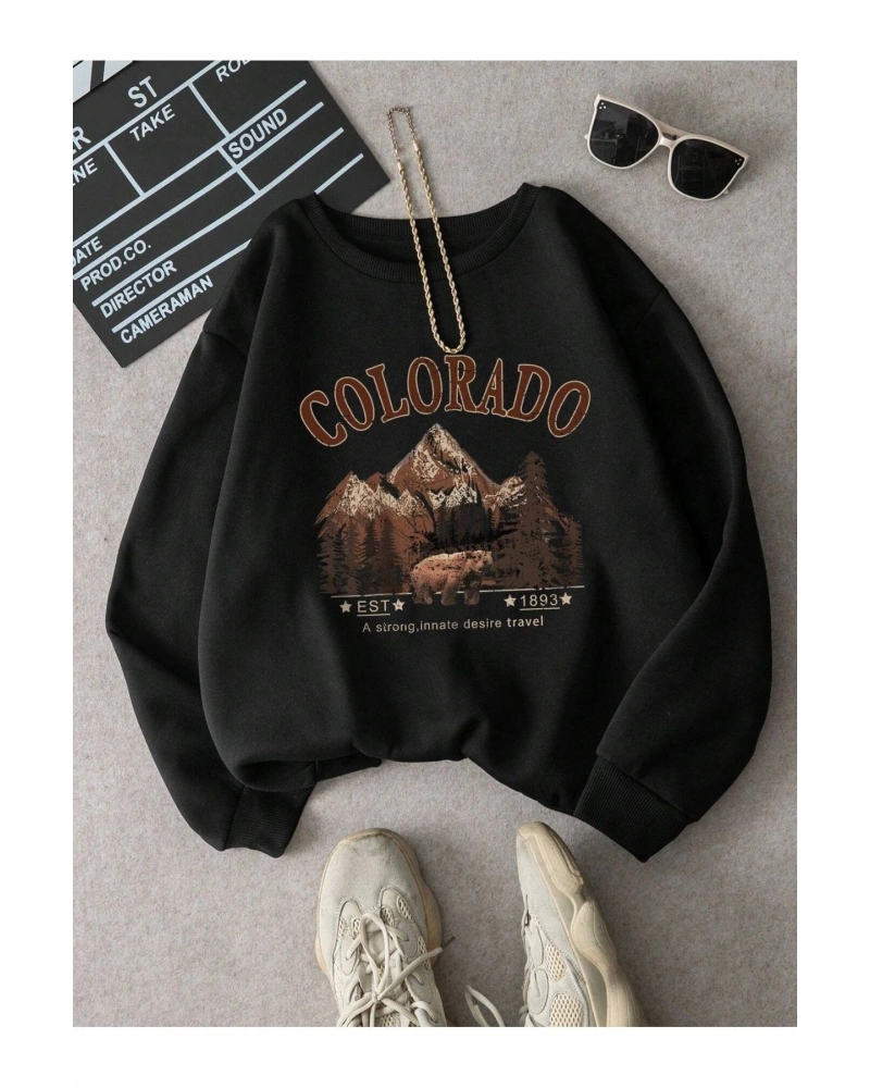 Colorado Baskılı Üç İplik Unisex Oversize Sweatshirt Siyah