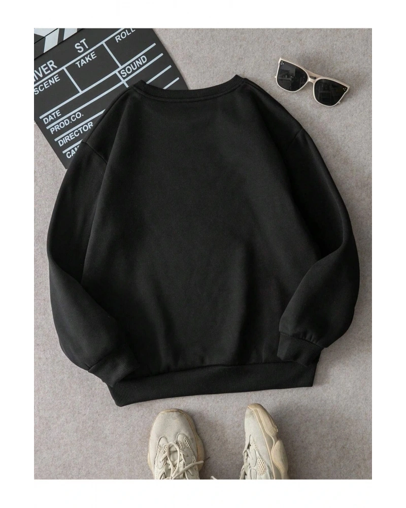 Siyah Yakasız Tüy Baskılı Unisex Sweatshirt
