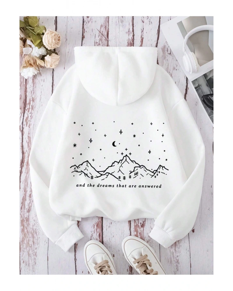 Dağ ve Slogan Grafikli Kanguru Cepli İpli Kapüşonlu Üst Beyaz