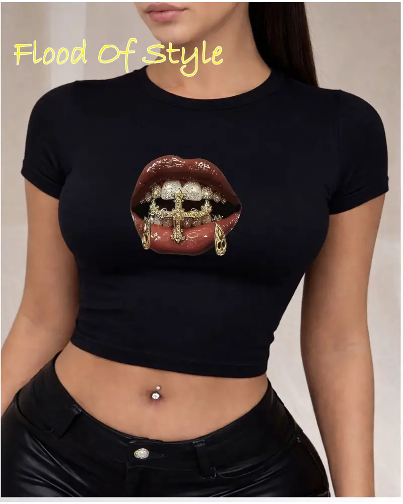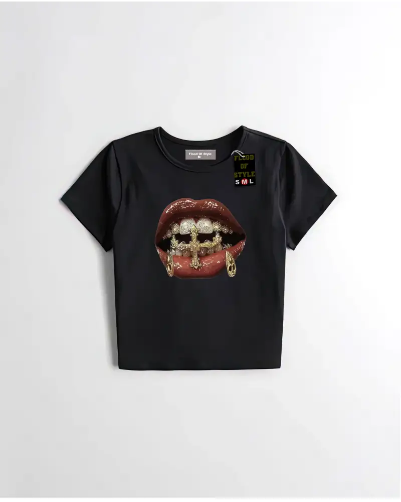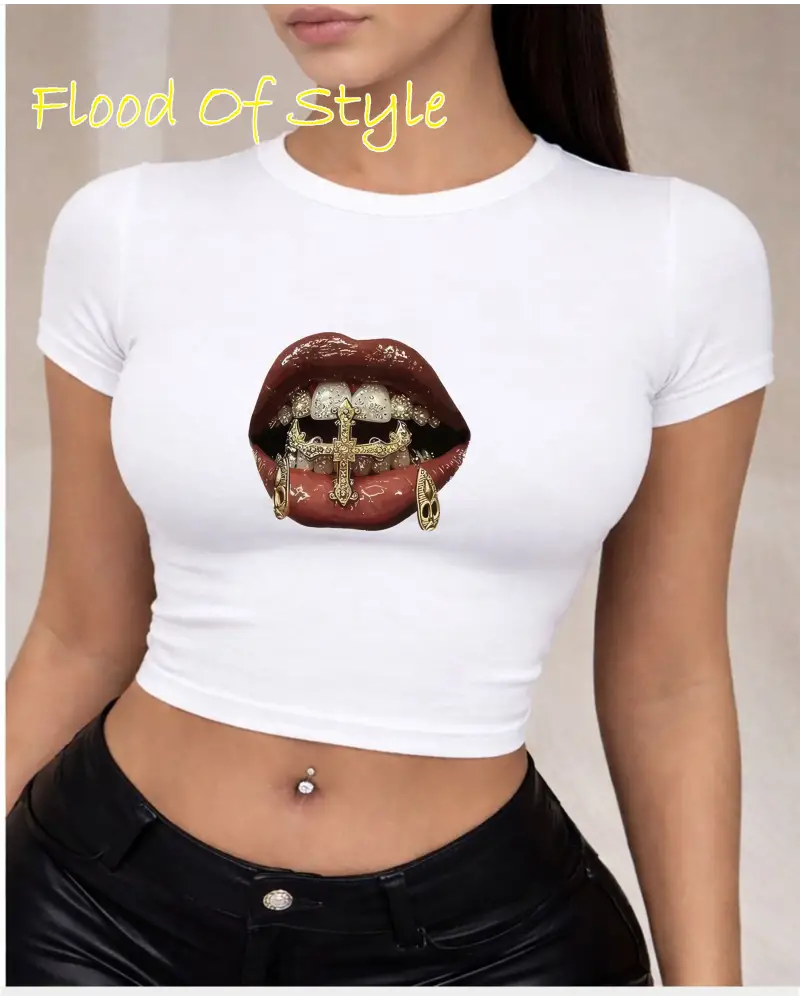 Beyaz Babby Tee dudak diş baskılı taş desen litee Özel tasarım