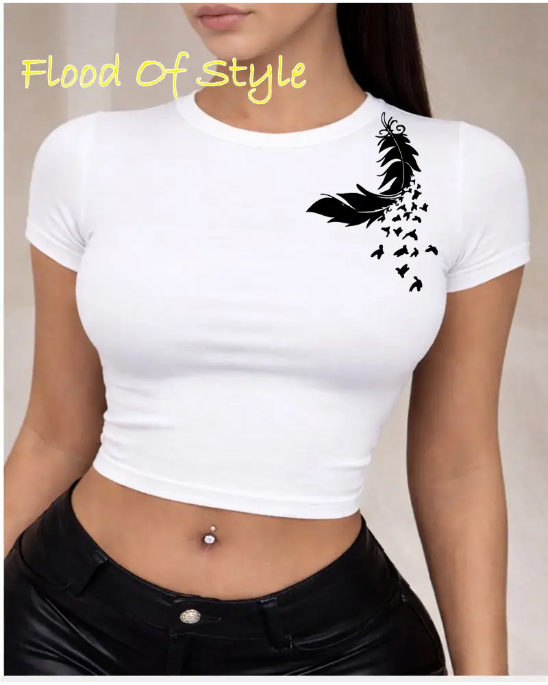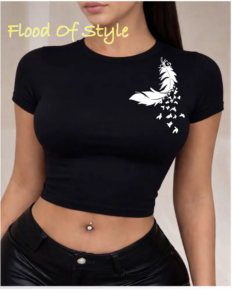 Kelebek Kalp Grafik Baskı Kadın Kırpma T-Shirt Yaz Yüksek Elastik O-Boyun Üstleri Seksi Ince