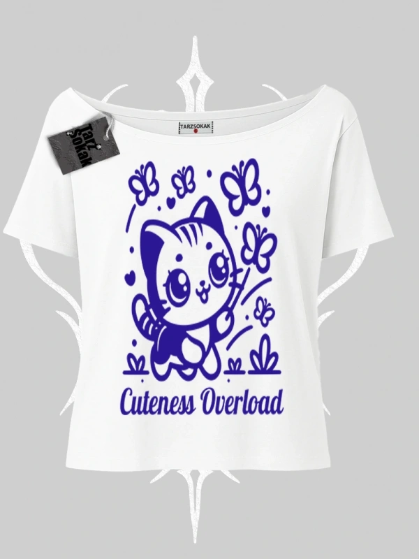 Cuteness Overload Kedi Baskılı Kayık Yaka Tshirt