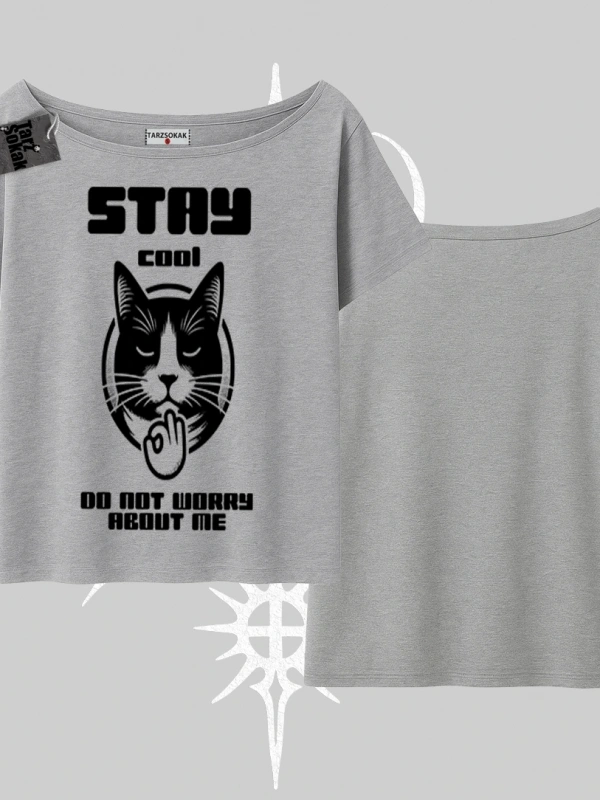 Cool Meow Yazılı Sevimli Kedi Arka Baskılı Kayık Yaka Tshirt