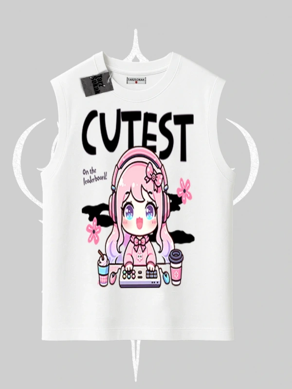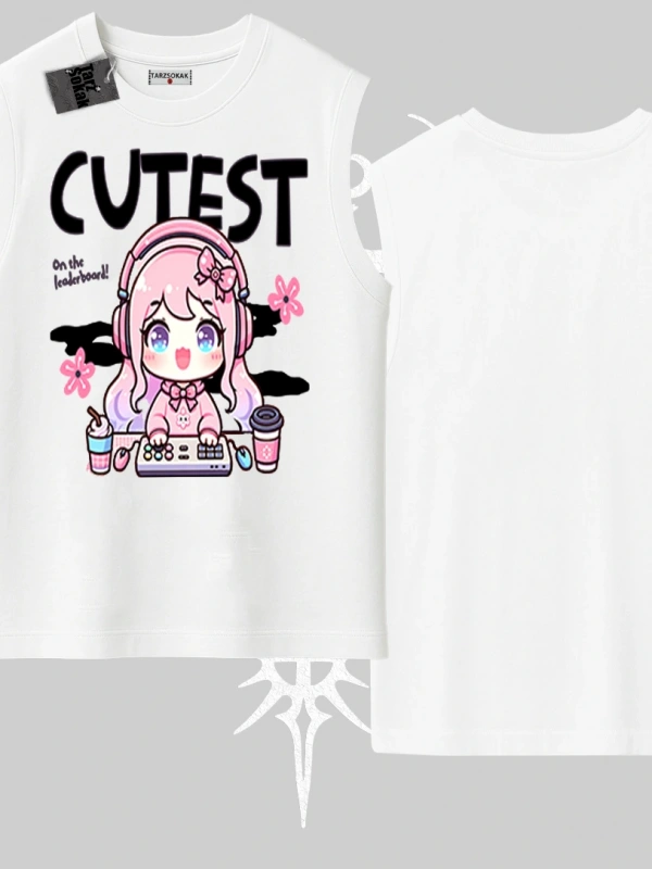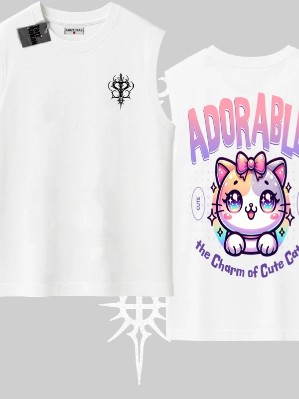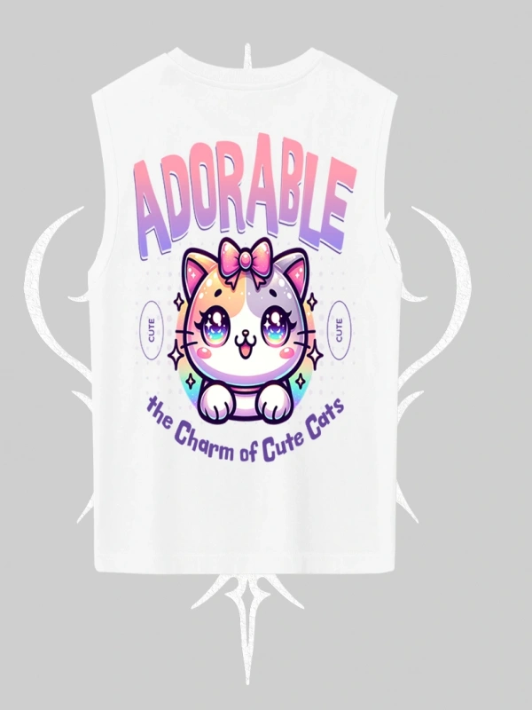 Adorable Kawaii Kedi Arka Baskılı Kolsuz Tshirt