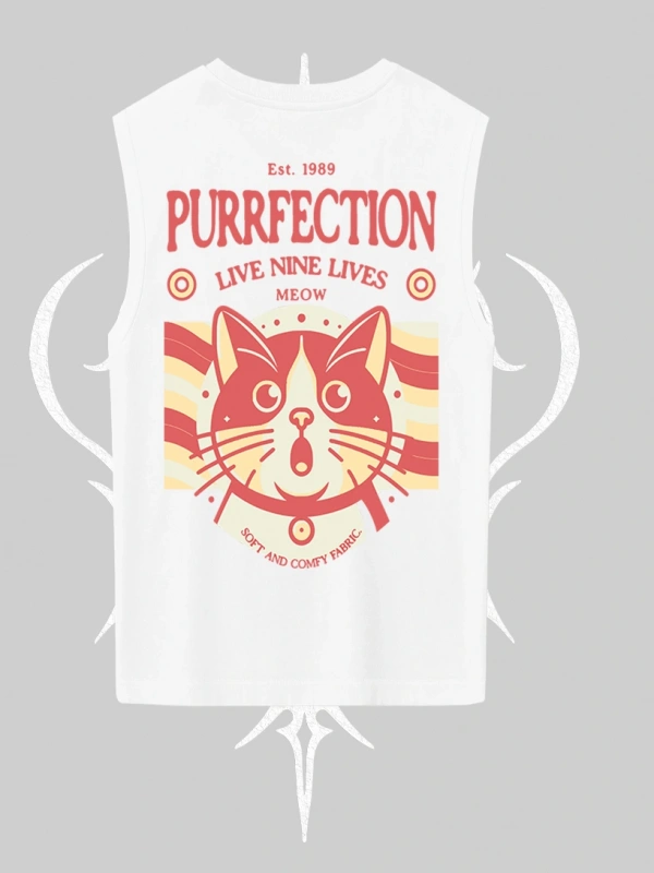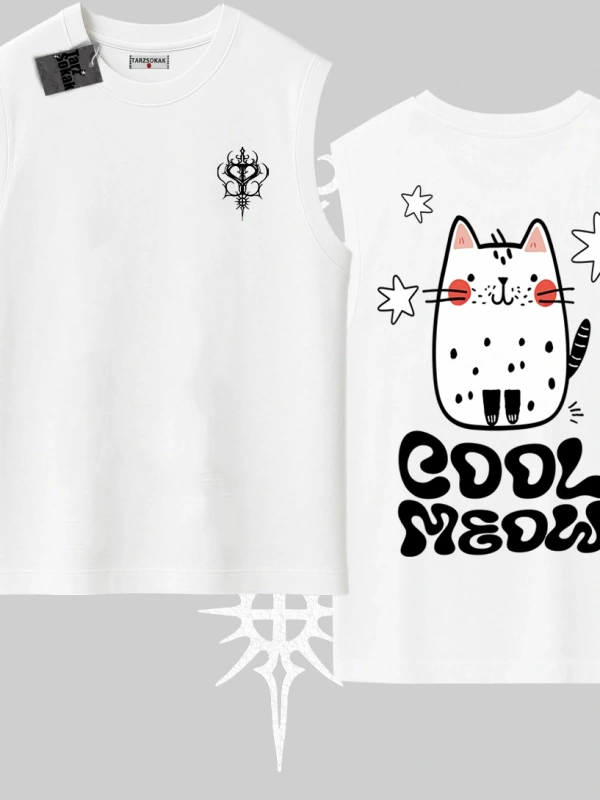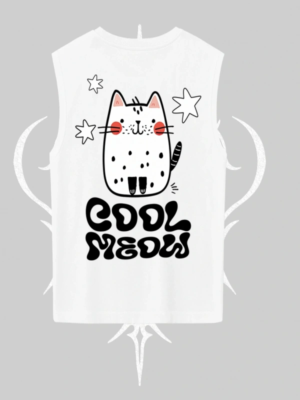 Cool Meow Yazılı Sevimli Kedi Arka Baskılı Kolsuz Tshirt
