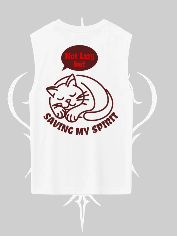 Not Lazy Saving My Spirit Kedi Baskılı Kolsuz Tshirt