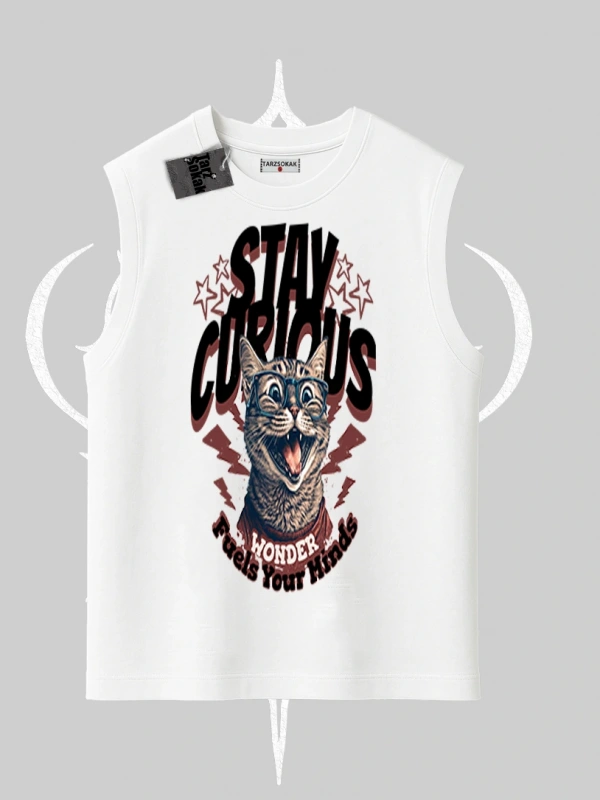 Stay Curious Kedi Baskılı Kolsuz Tshirt