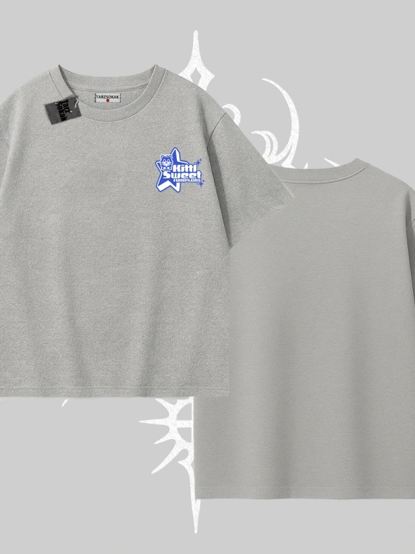 Born to Be a Star Yazılı Sevimli Kedi Arka Baskılı Oversize Tshirt