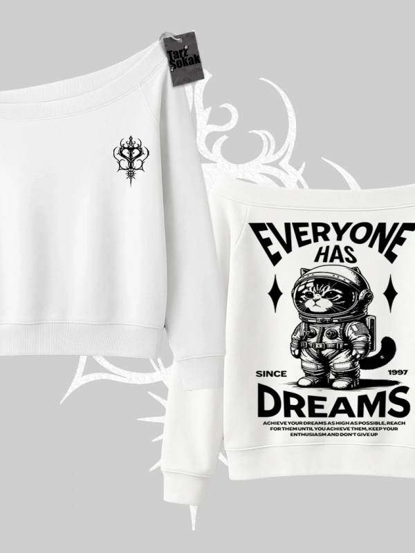 Everyone Has Dreams Yazılı Astronot Kedi Arka Baskılı Kayık Yaka Sweatshirt