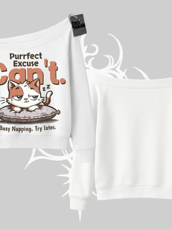 Kedi Baskılı Cant Busy Napping Y2K Kayık Yaka Sweatshirt