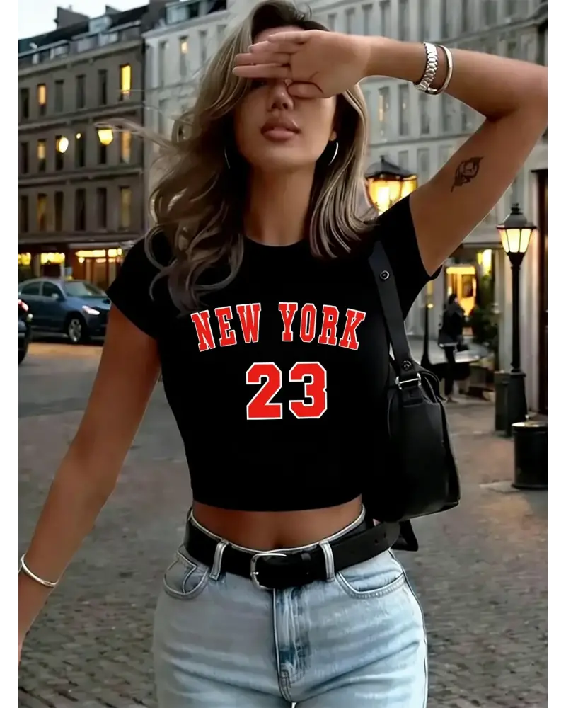 New York 23 Mektup Baskılar Bayan Kırpma Tişörtleri Yaz O-Boyun Yumuşak Üstler Seksi İnce Sok kaliteli malzeme ve konforlu kullanım sunan bir üründür. Günlük kullanım için ideal olup uygun fiyat ve hızlı kargo avantajıyla sunulmaktadır.