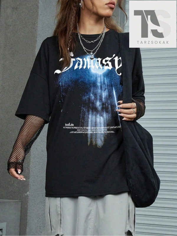 Çiçek & Slogan Grafikli Düşük Omuzlu Tişört