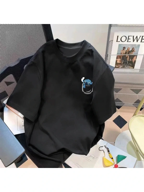 Siyah Eğlenceli ve Sevimli Kedi ve Köpek Desen Gevşek Tshirt Vintage Üst FemaleT-Shir