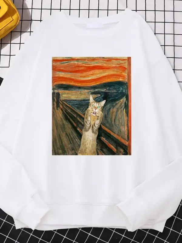 Rahat sokak kadın kazak yağlıboya Cat'S catbaskı Hoody rahat polar kazak gevşek sıcak kadın s