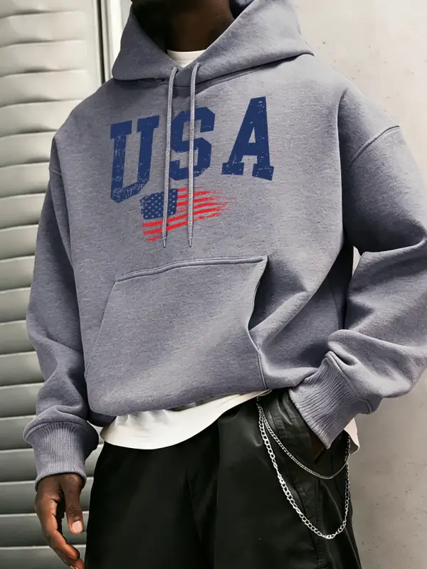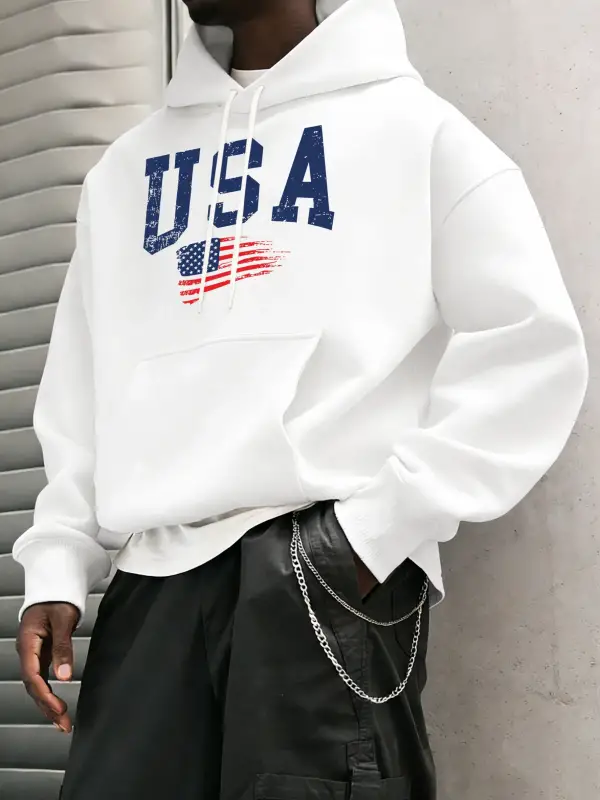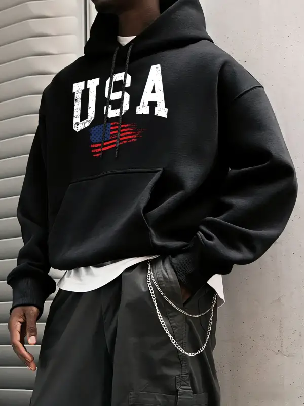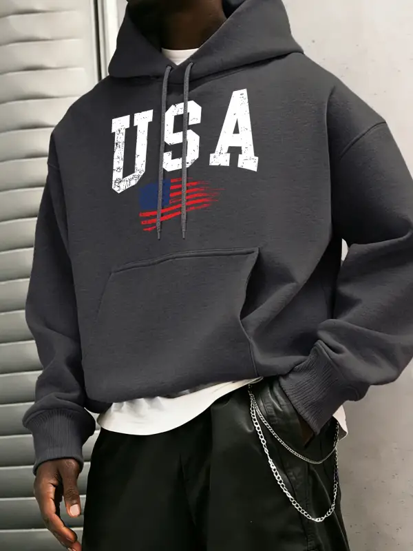 ABD Harfli Amerikan Bayrağı Baskılı Erkek Klasik Kapüşonlu Sokak Stili Günlük Polar Sweatshir