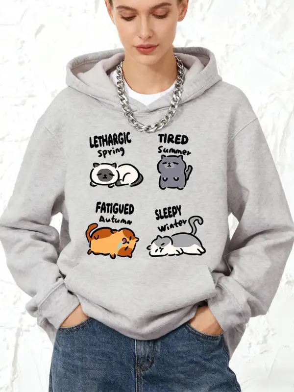 Lethargic Yorgun Uykulu Kedi Baskılı Kapüşonlu Üstler Pamuklu Kadın Sportif Bol Üstler Kışlık