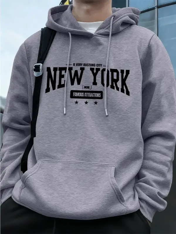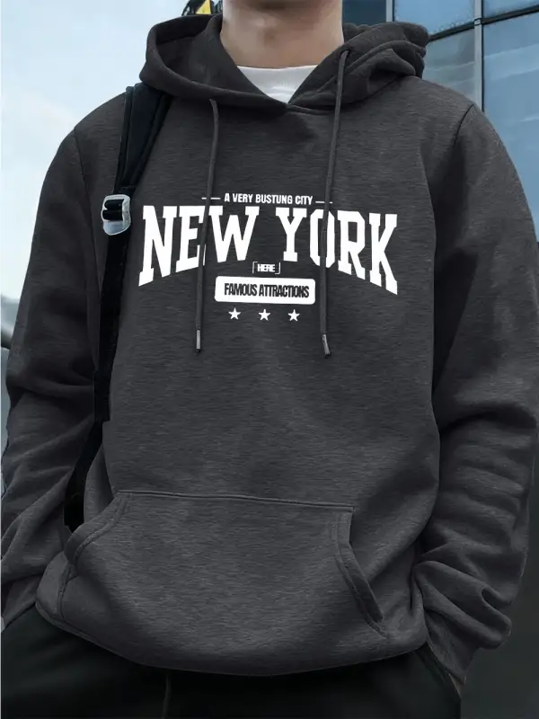 New York Bustling City Baskılı Erkek Tişörtü Kışlık Oversize Kapüşonlu Üst Spor Cepli Polar S