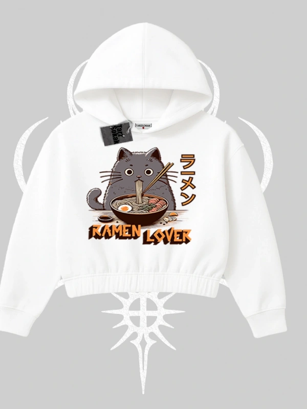 Kapşonlu Crop Sweatshirt Ramen Lover Kedi Anime Baskılı