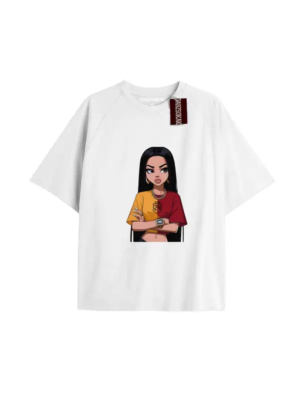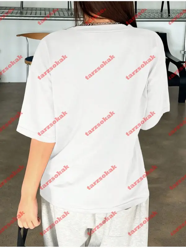 Sloganlı Grafik Yama Detaylı Düşük Omuz Tişört