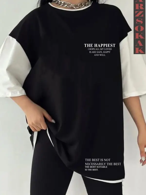 Siyah Oversize Çift Renk HAPPİEST YAZI Baskılı Unisex Tshirt