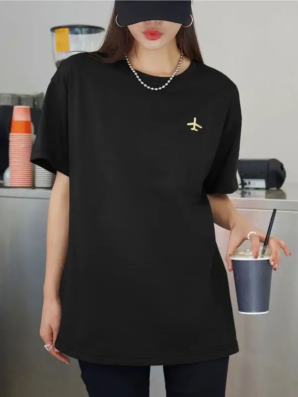 Kadın Siyah Airplane Baskılı Oversize T-shirt