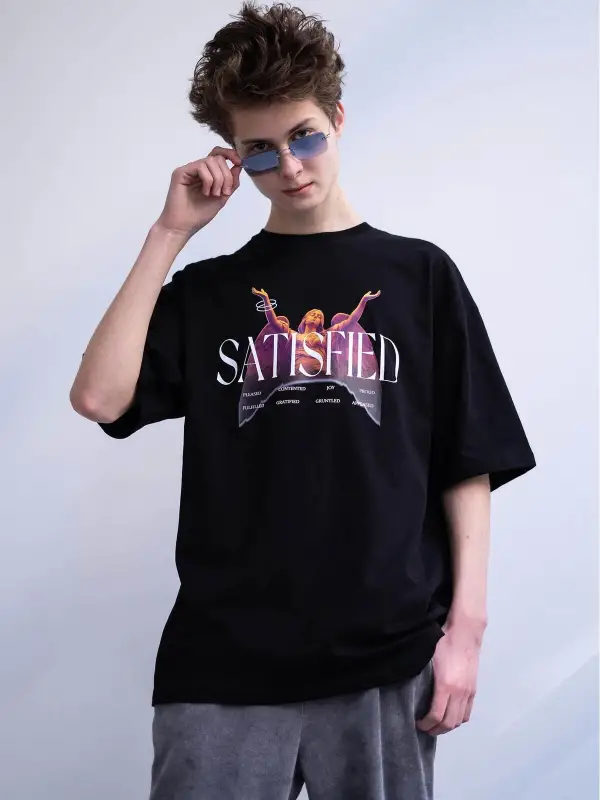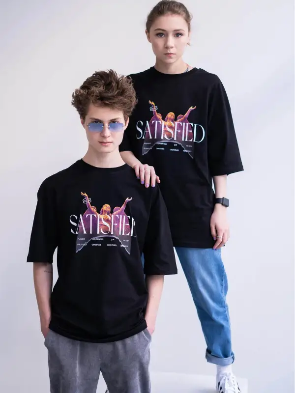 Unisex Siyah Hanımcı Baskılı Katlamalı Bisiklet Yaka Tişört