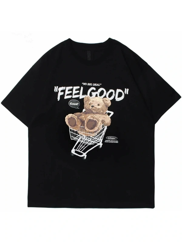 Siyah Feel Good Ayı Baskılı Oversize Bisiklet Yaka Erkek Tişört