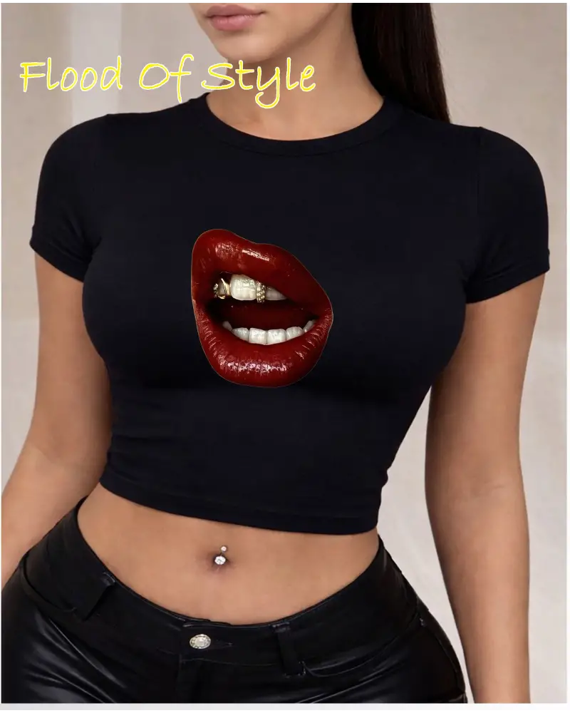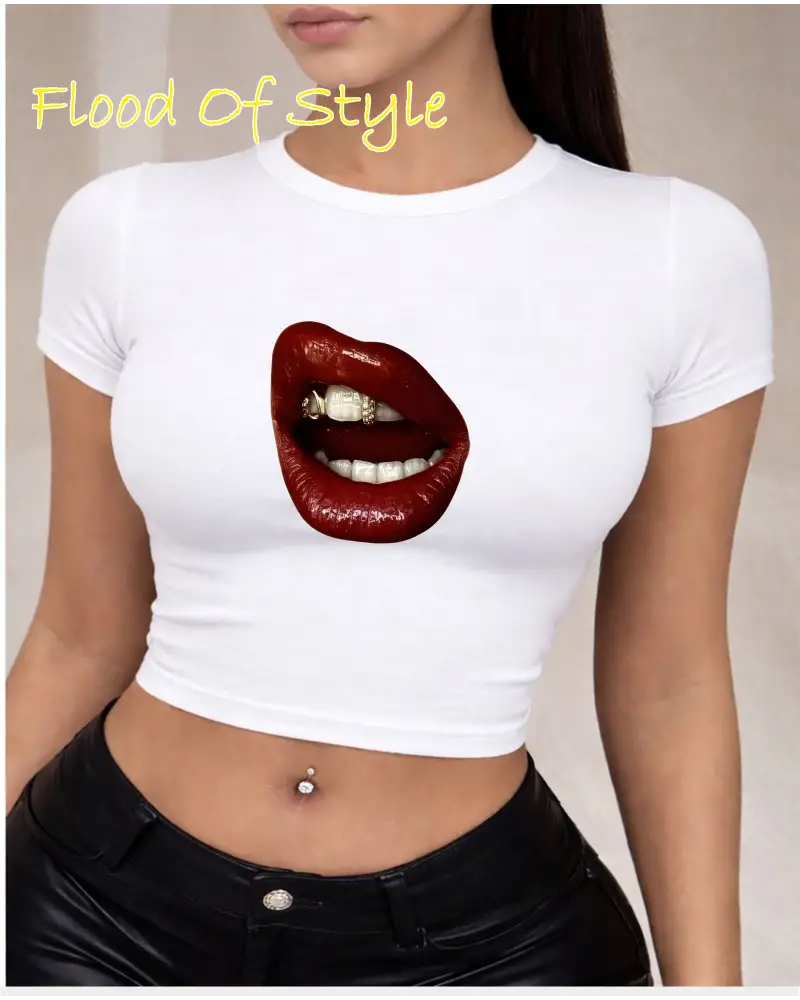 Kelebek Kalp Grafik Baskılar Bayan Kırpma Üstleri Yaz Yumuşak Yüksek Elastik Tişörtler Sokak