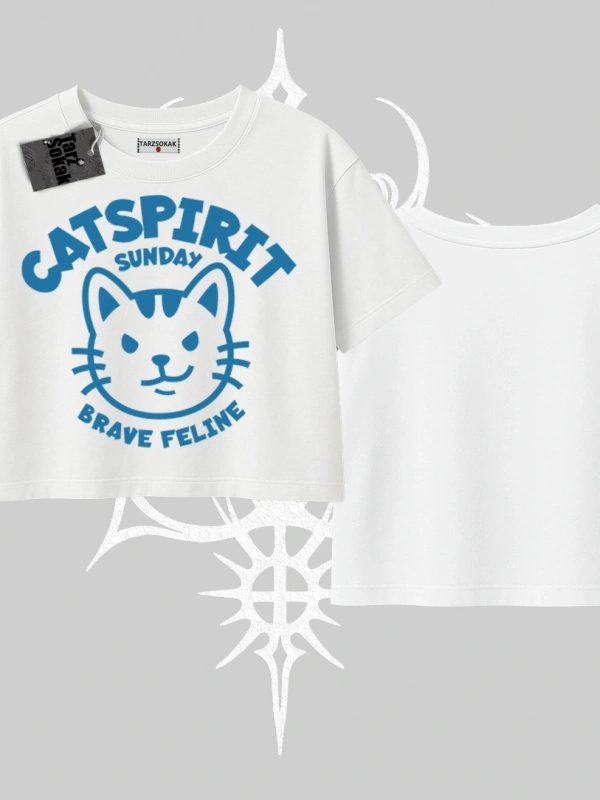 Catspirit Sunday Brave Feline Yazılı Kedi Baskılı Oversize Crop Tshirt