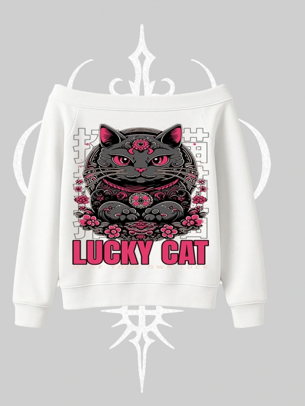 Lucky Cat Japon Tarzı Kedi Baskılı Kayık Yaka Sweatshirt