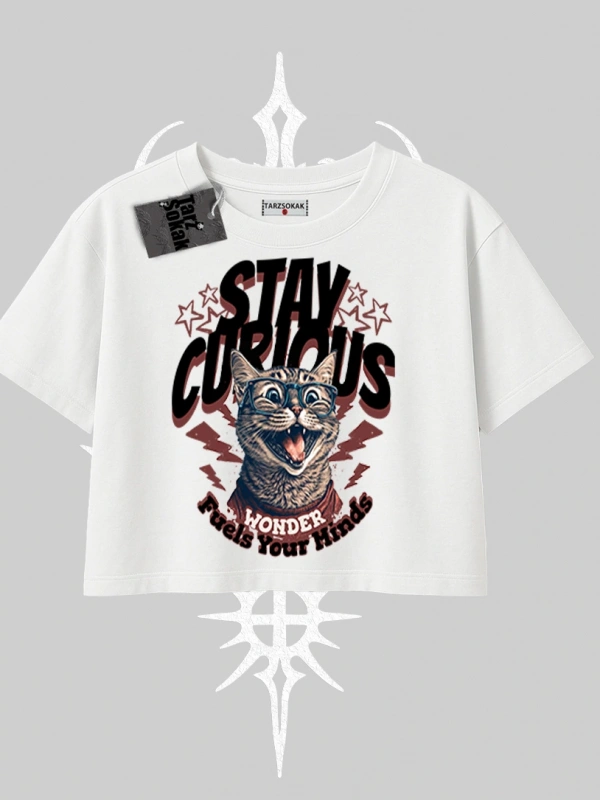 Stay Curious Kedi Baskılı Oversize Crop Tshirt