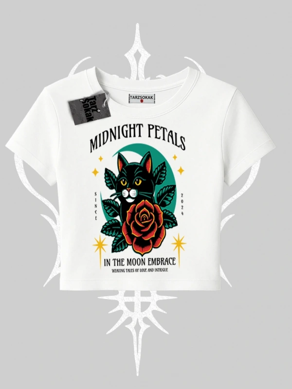 Midnight Petals Kedi Baskılı Babby Tee Tshirt