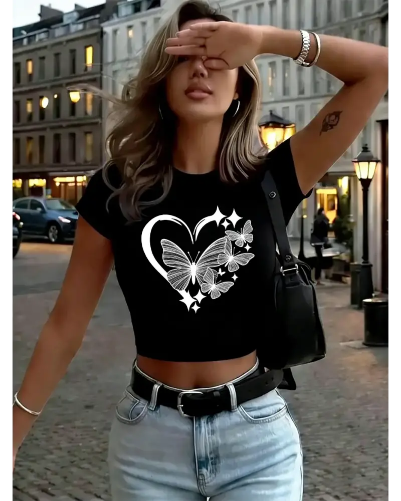 Kelebek Kalp Grafik Baskı Kadın Kırpma T-Shirt Yaz Yüksek Elastik O-Boyun Üstleri Seksi Ince kaliteli malzeme ve konforlu kullanım sunan bir üründür. Günlük kullanım için ideal olup uygun fiyat ve hızlı kargo avantajıyla sunulmaktadır.