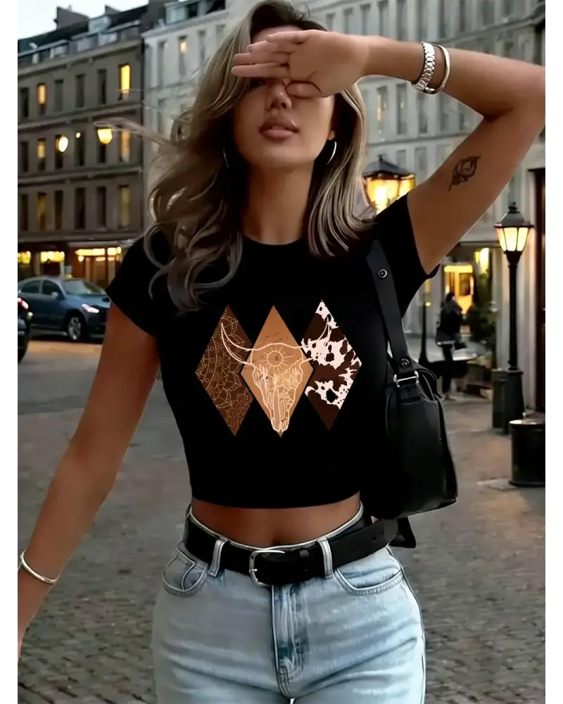 Kovboy Tarzı Desen Baskı Bayan Kırpma Tişörtleri Yaz Yüksek Elastik O-Boyun Üstleri Sokak İnc kaliteli malzeme ve konforlu kullanım sunan bir üründür. Günlük kullanım için ideal olup uygun fiyat ve hızlı kargo avantajıyla sunulmaktadır.