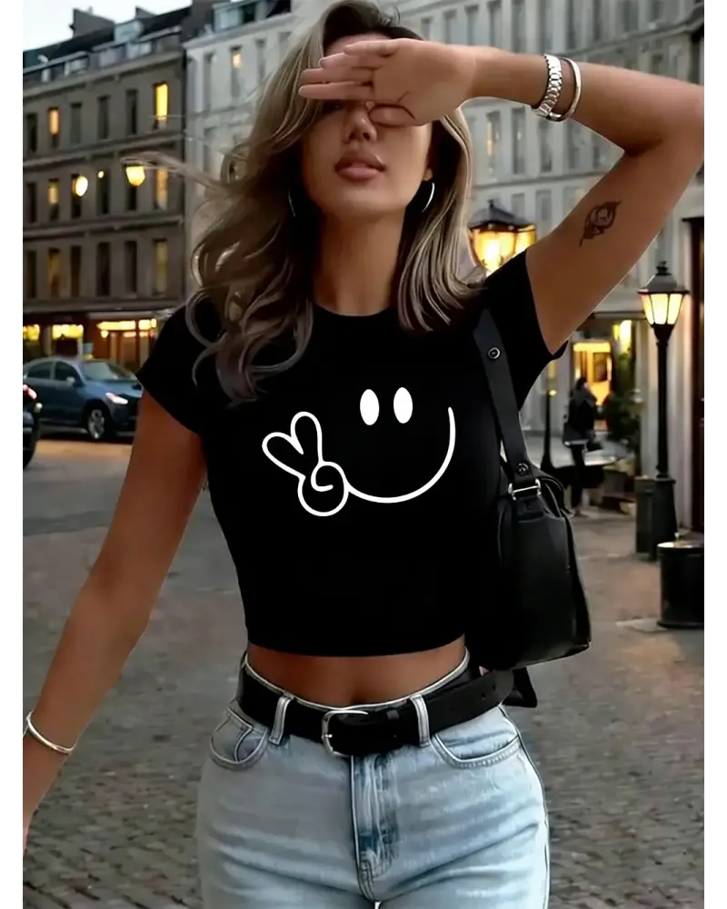Makas El Gülümseme Grafik Baskılar Bayan Kırpma Üstleri Yaz Yüksek Elastik O-Boyun Tees Y2K İ kaliteli malzeme ve konforlu kullanım sunan bir üründür. Günlük kullanım için ideal olup uygun fiyat ve hızlı kargo avantajıyla sunulmaktadır.