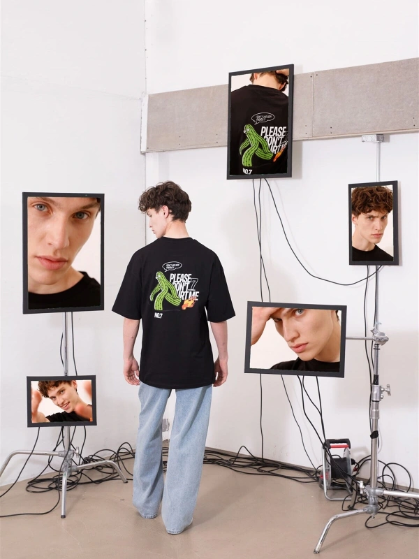 Erkek Siyah Melek Baskılı Oversize Bisiklet Yaka Tshirt