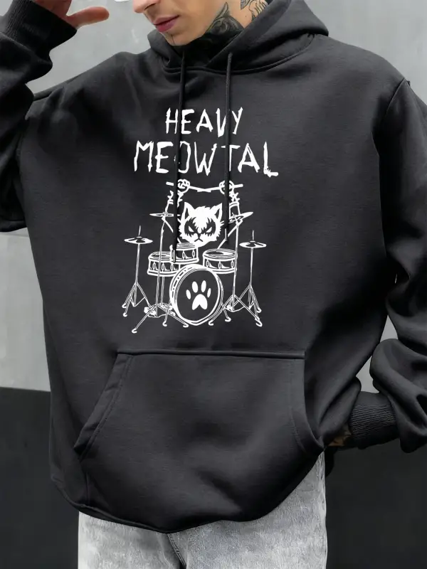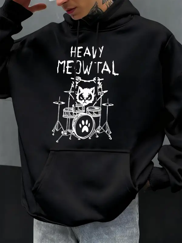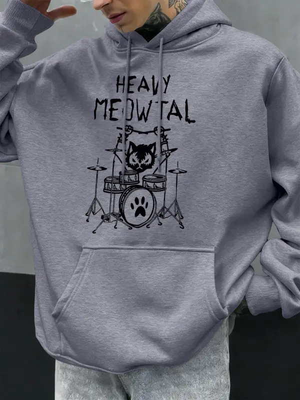 Ağır Meowtal kediler davul çalan komik tasarım erkekler kapüşonlu svetşörtler cepli kapüşonlu