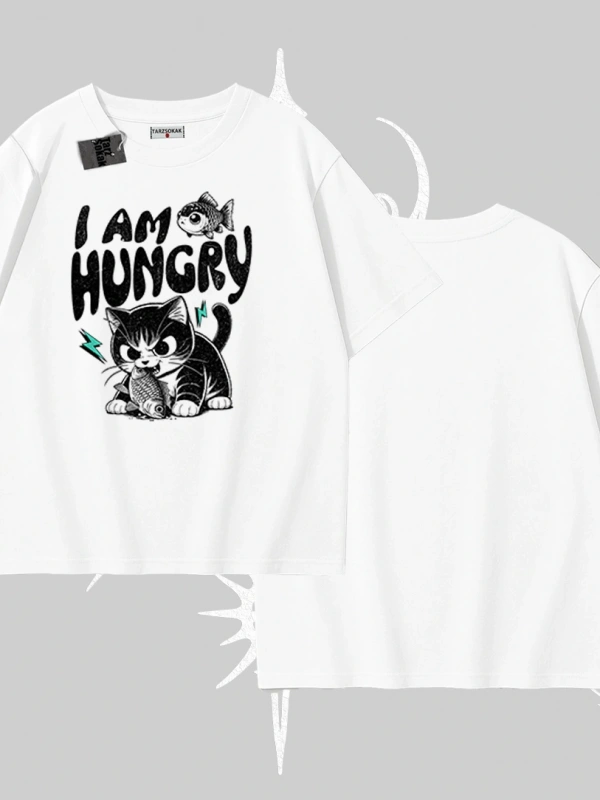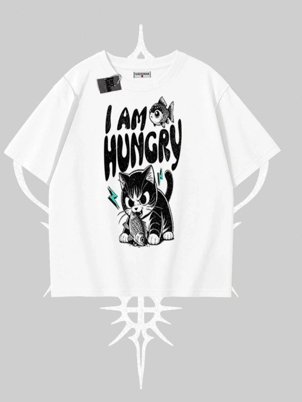Am Hungry Kedi Baskılı Oversize Tshirt