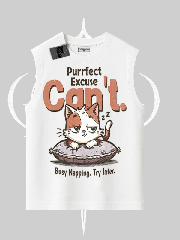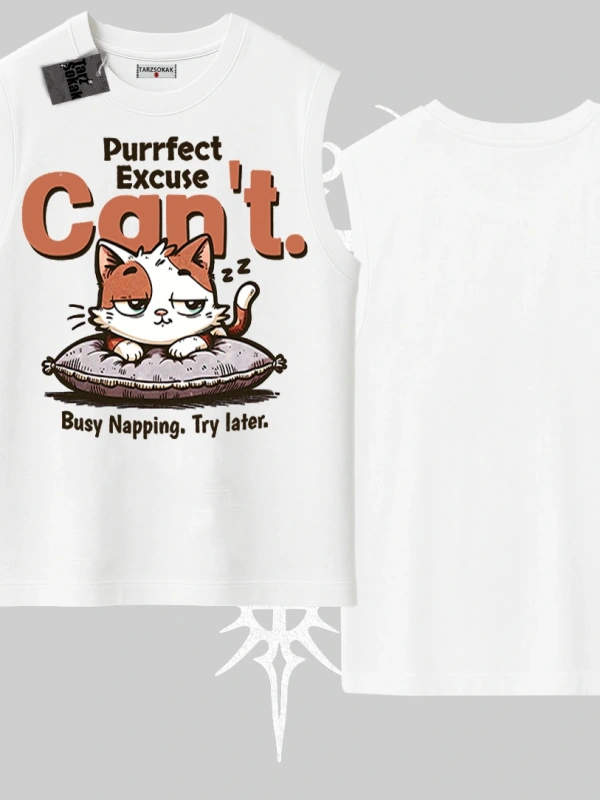 Kedi Baskılı Cant Busy Napping Y2K Kolsuz Tshirt