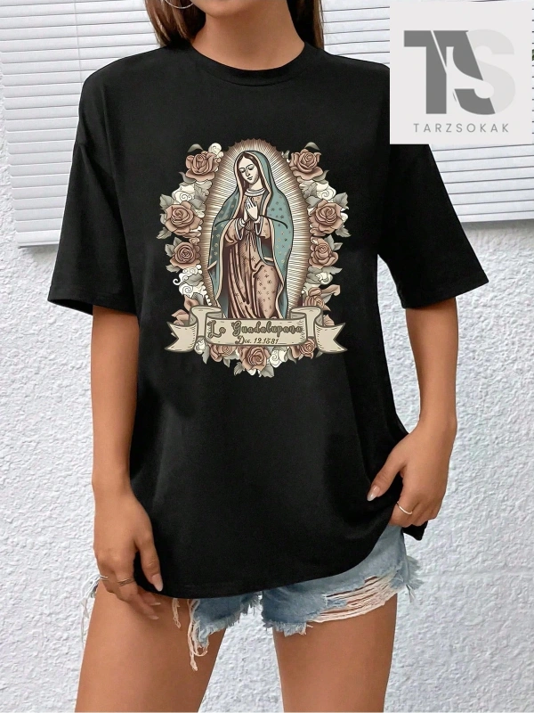 Çiçek, Mektup ve Meryem Ana Baskılı Tişört