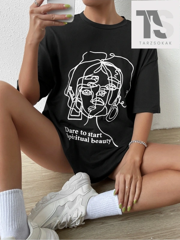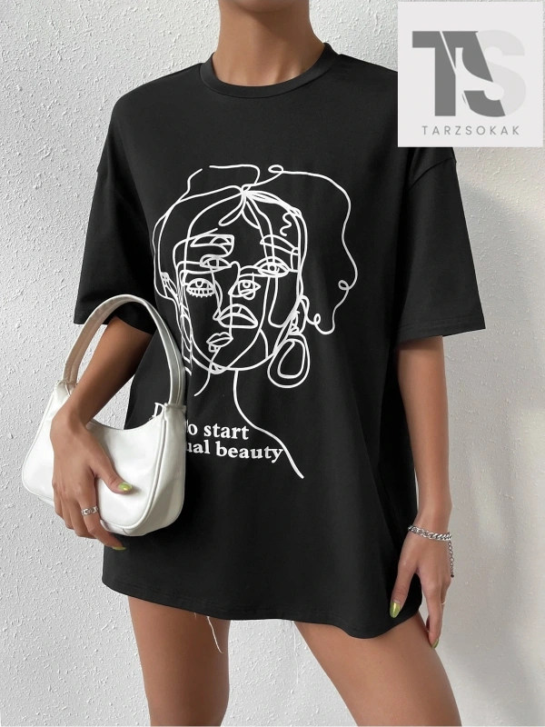 Unisex BAY Kadın Bol Kesim Karikatür Yüz Desenli Tişört KOD-1359