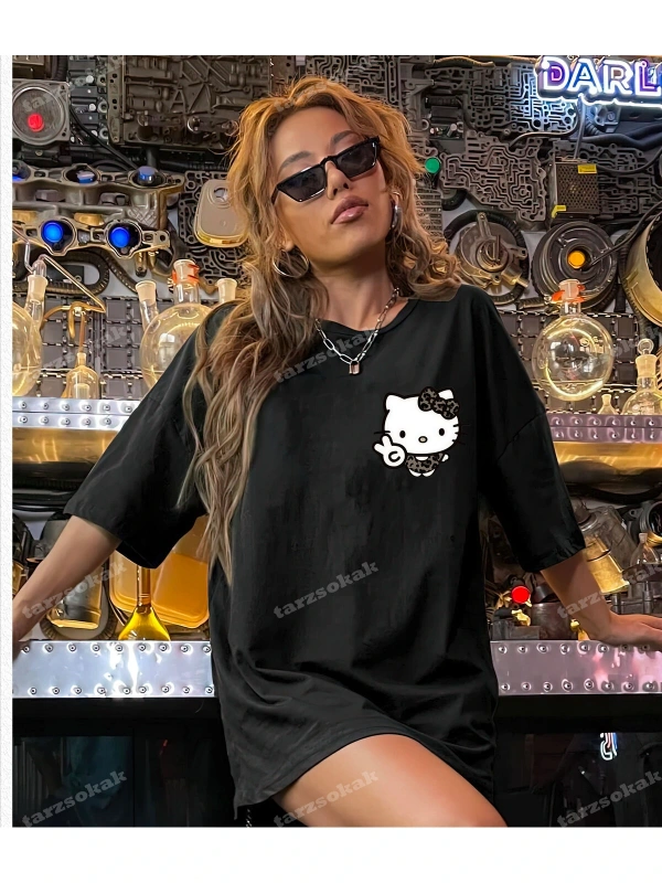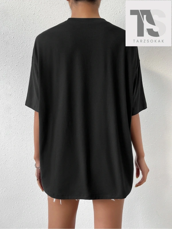Japon Harfli ve Karikatür Grafikli Düşük Omuzlu Tişört